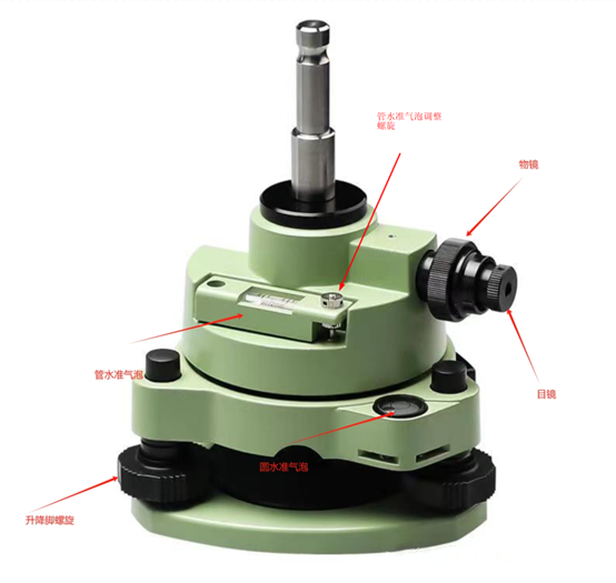 2.管水准气泡:精平主要参考对象,通过调整升降脚螺旋来使管水准气泡四个面均向同一个方向偏移同样的量(或者都居中)达到精平。