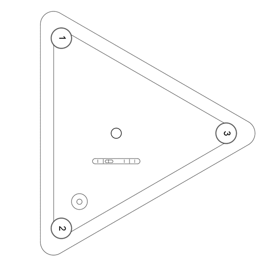 15.松开基座与脚架的连接螺旋,平移基座至刚刚偏移量的同方向一半位置,如下图所示此时应为左上方2mm位置处,再整平确认无误。