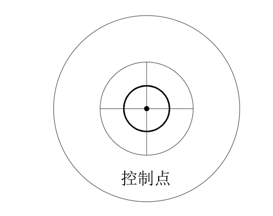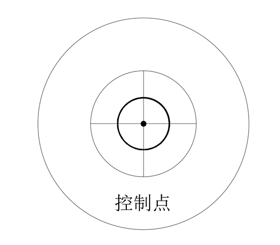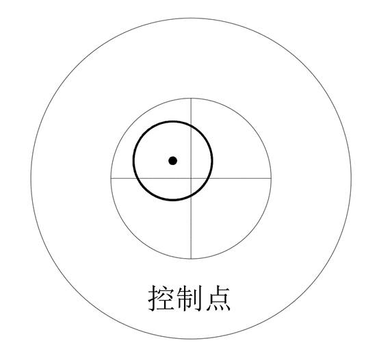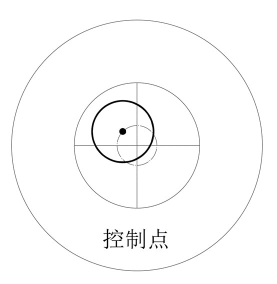 17.最终检核:在对中整平结束后转动基座,边转边看下对中,小圆圈中心小黑点在转动过程中会动,小黑点的运动轨迹应该是以控制点为中心的圆,如下图中虚线所表示的圆,若下对中偏差大则是大圆,若下对中偏差小则是小圆,若下对中没有偏差则始终在控制点中心。对中整平合格后量取仪器三个方向的仪器高不会超过3mm,若超过3mm则需重新对中整平。