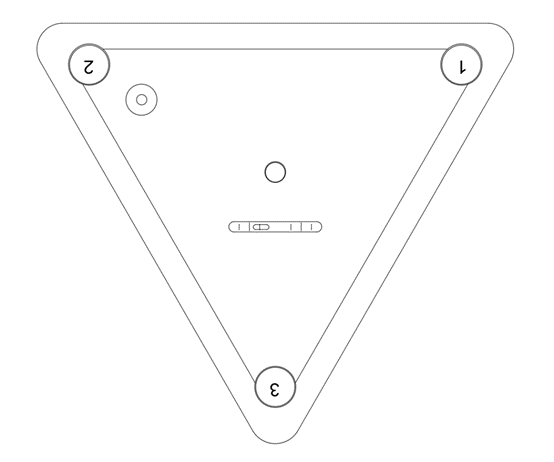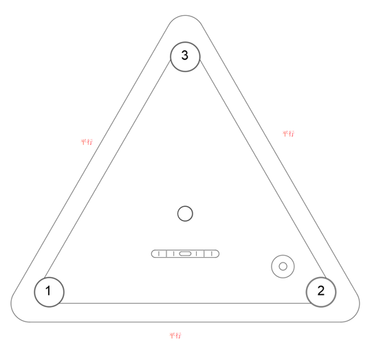 7.以基座其中两个1、2号脚螺旋连线为基准,让水准管气泡方向与之平行,两个螺旋同时向内或者同时向外旋转,使水准管气泡在这个方向完全居中。