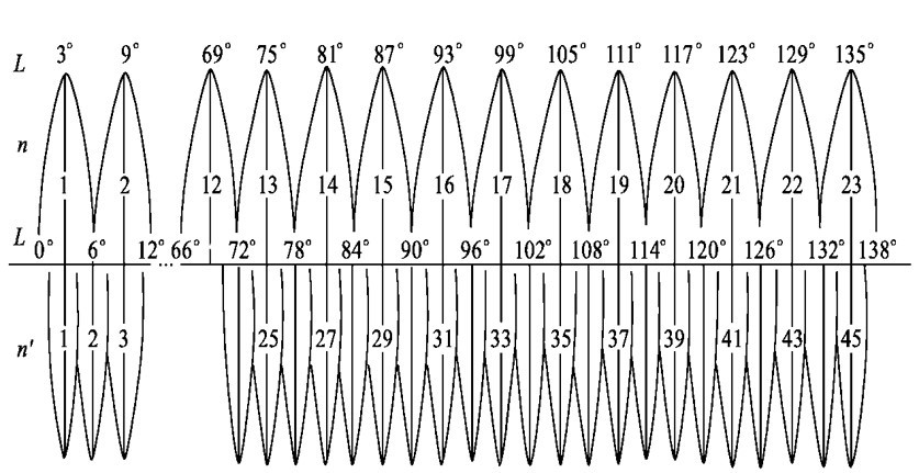 自本初子午线由西向东每隔经差6°为一带,依次按编号n=1~60。