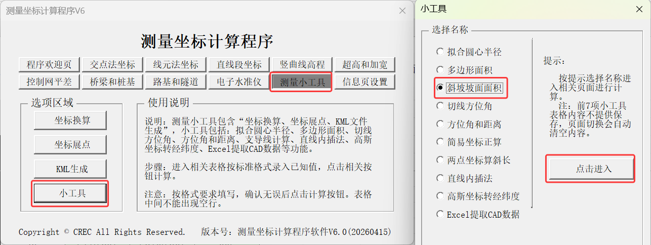 1.运行“测量坐标计算程序V6”→测量小工具→小工具→斜坡坡面面积→点击进入。