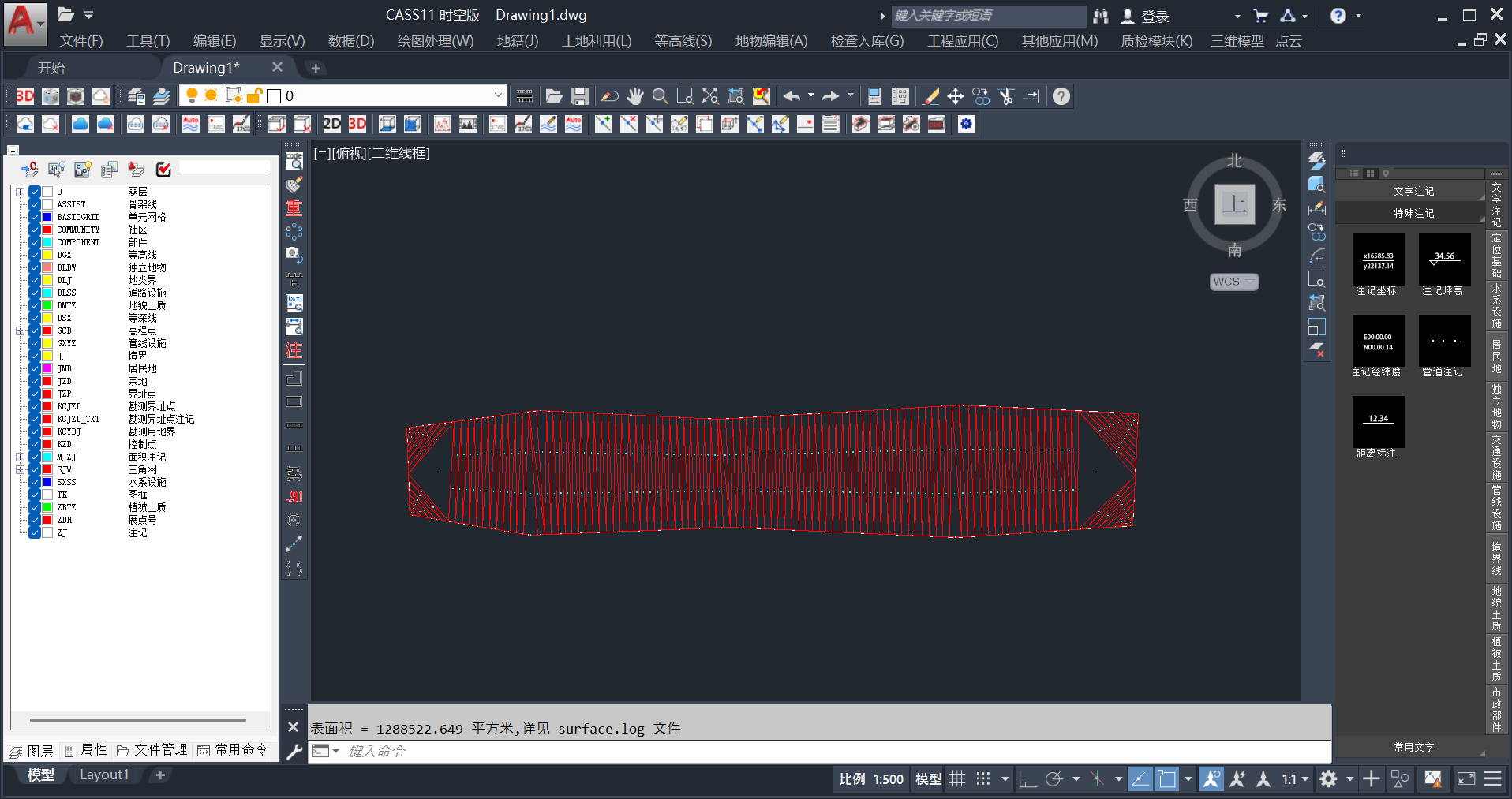 1.点击菜单栏“工程应用”→“表面积计算”→“根据坐标文件”→“选择计算区域边界线”→选择“*.dat文件”打开→输入“边界插值间隔”→完成(在命令行窗口显示结果)。