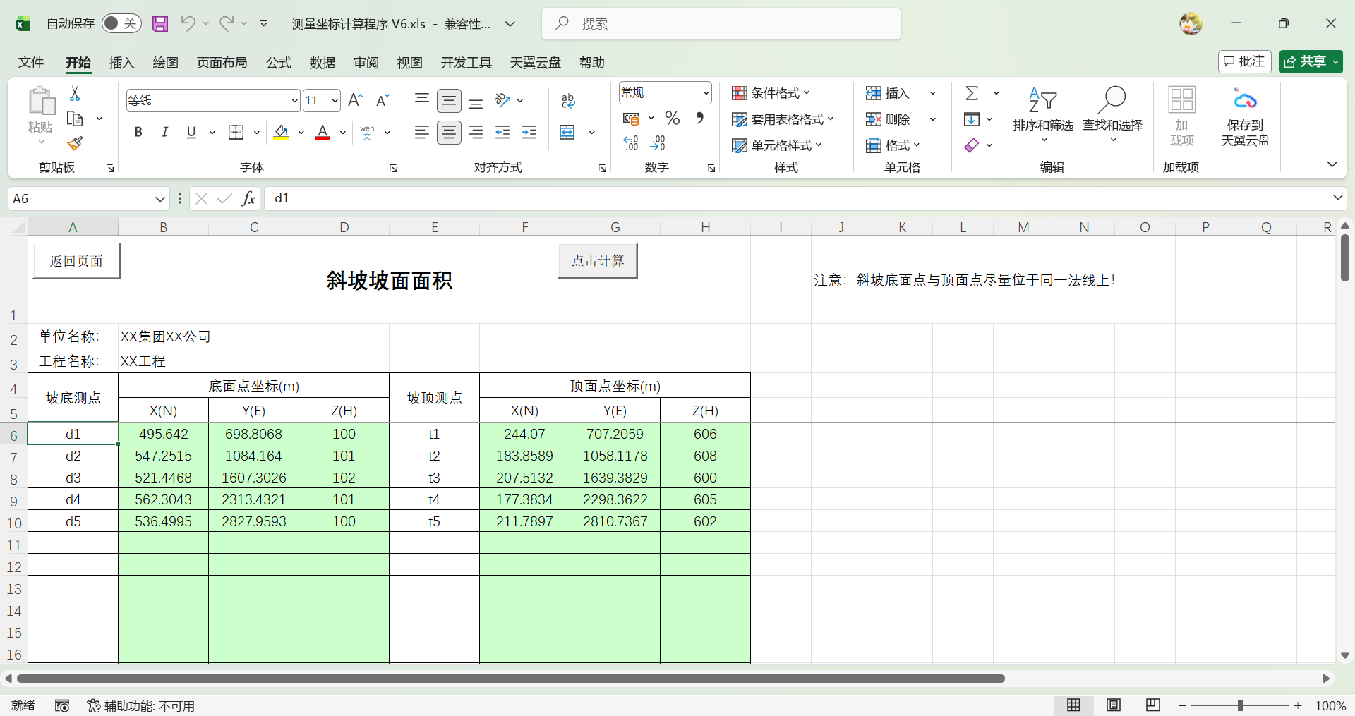 2.在表格中依次录入斜坡底面点和顶面点坐标高程。