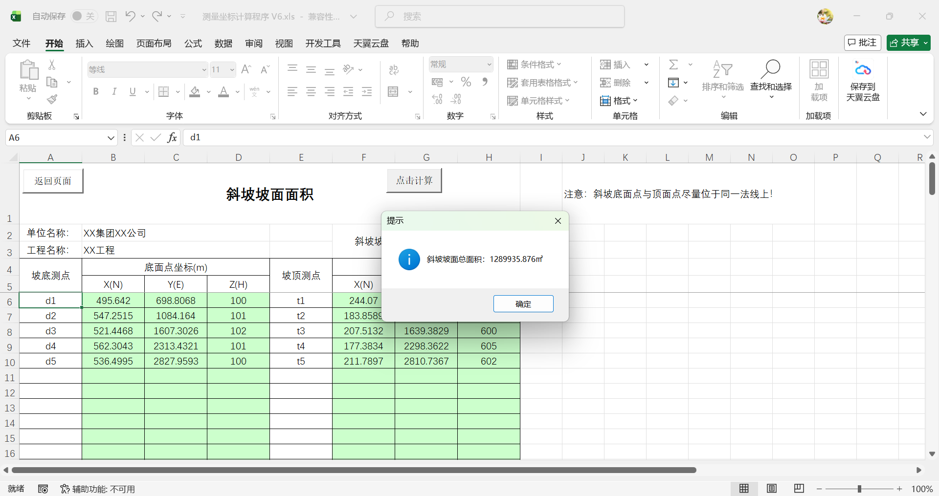 1.进入“斜坡坡面面积”表格→点击计算按钮→完成(提示窗显示斜坡坡面总面积)。