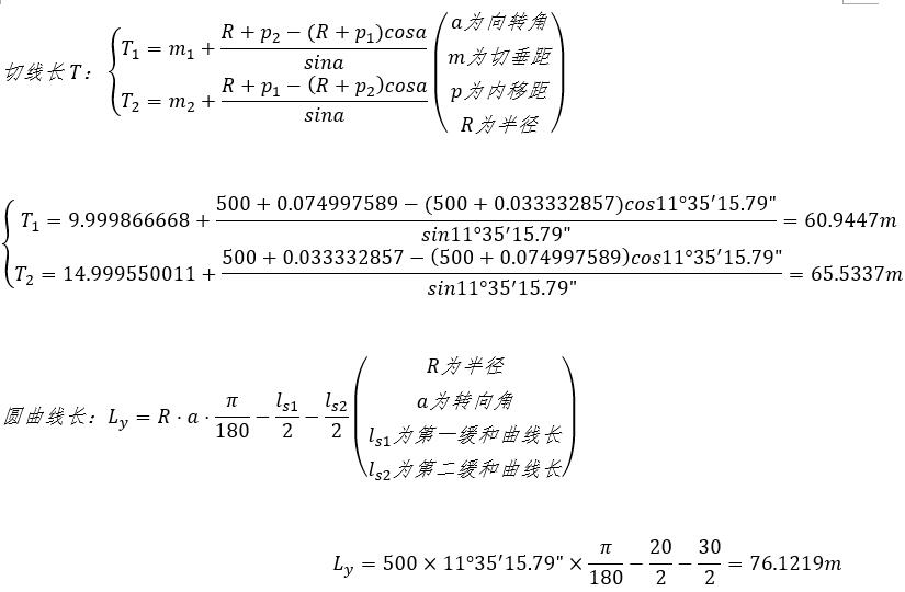 由缓和曲线基本公式可求出m1、m2、p1、p2该公式属于无限多项式,这里取前3项作为基本公式,然后可通过m1、m2、p1、p2计算切线长T1、T2等。